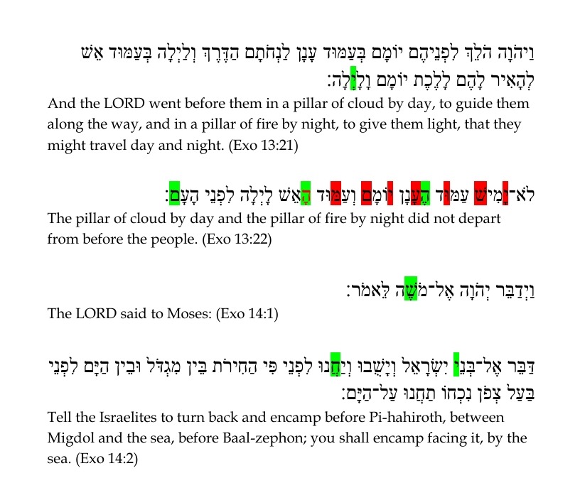 A similar difficulty arises with the verse Exo 13:21-22 stating that “YHVH did not remove the pillar of cloud by day and the pillar of fire by night from before the people”, but Exo 14:19 states “the pillar of cloud went from before them and stood behind them”.